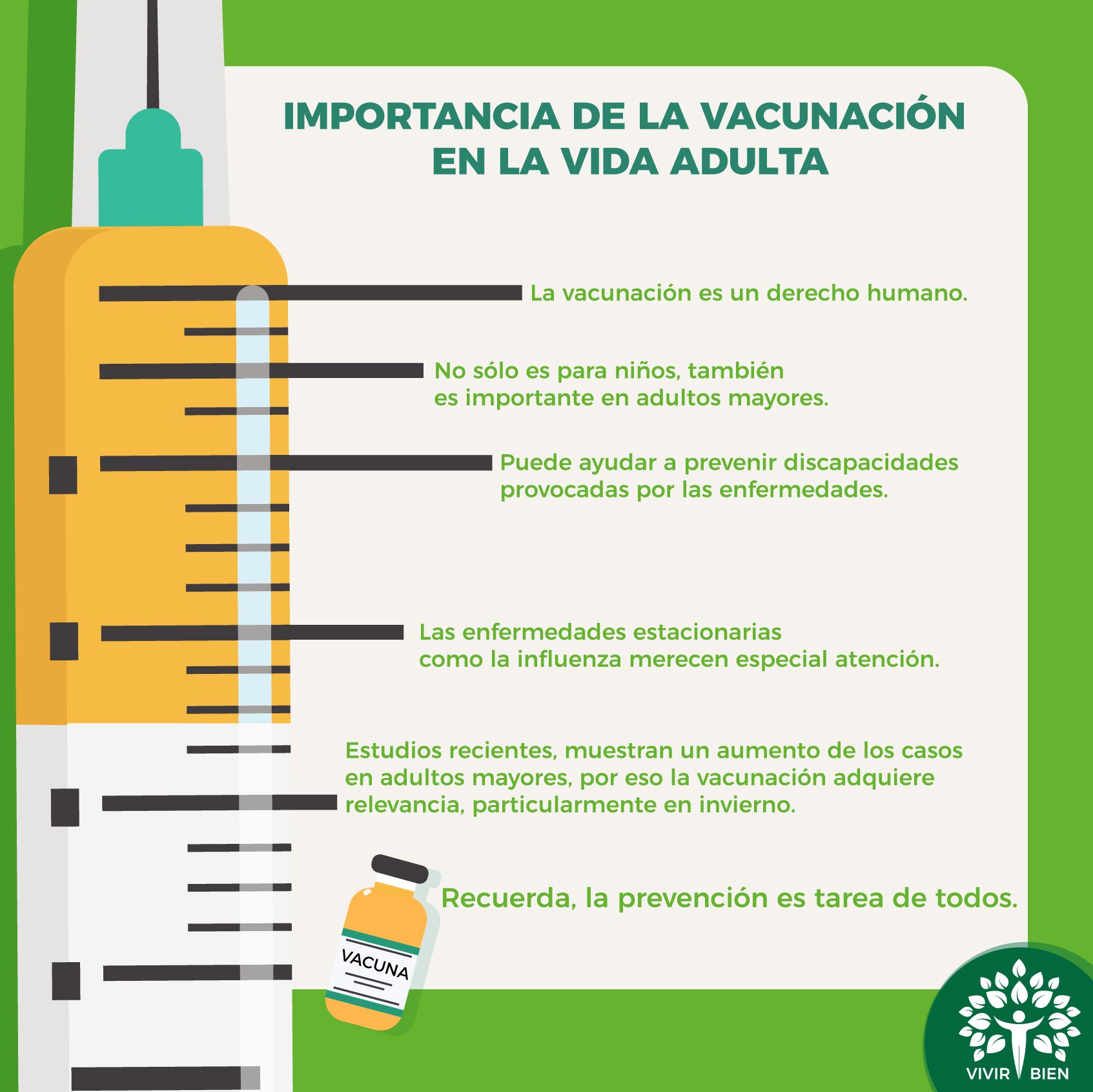 Importancia de la vacunación en la vida adulta Prevenir es parte fundamental de un buen estado de salud, infórmate de la importancia de la vacunación en la vida adulta Vivir Bien Tú salud nos importa, informate y ayuda a tu familia.