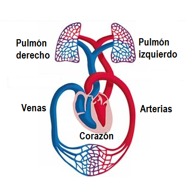 En los pulmones, la sangre que regresa al corazón a través de las venas se carga de oxígeno (O2) y descarga dióxido de carbono (CO2). La sangre oxigenada regresa al corazón y éste la bombea hacia todos los órganos del cuerpo.